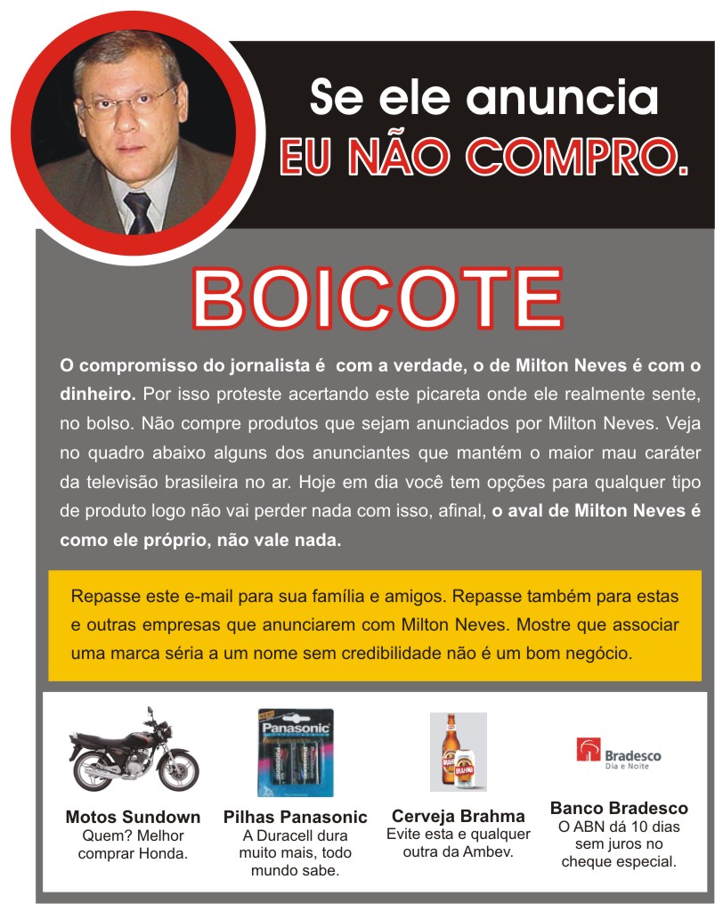 A primeira iniciativa dos torcedores foi um e-mail que circulou em forma de corrente entre atleticanos contendo um texto de repúdio a Milton Neves e aos produtos por ele anunciados. Logo em seguida, também passou a circular um e-mail de boicote (clique