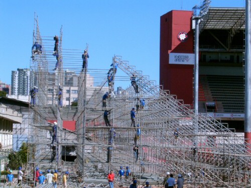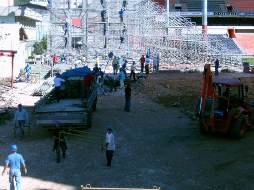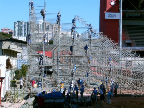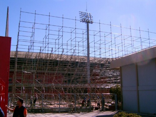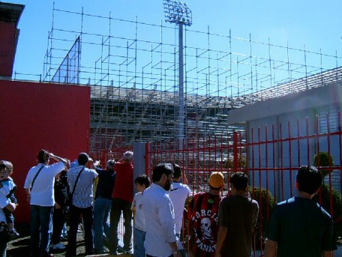 As obras de ampliação da Kyocera Arena estão bem adiantadas. As arquibancadas tubulares começaram a ser instaladas neste sábado e as obras prosseguiram durante toda a noite. Hoje, elas já formam uma estrutura bastante alta. As arquibancadas tubulares foram instaladas e já foram erguidas até a altura máxima. O próximo passo é ampliar as arquibanadas lateralmente. As canchas esportivas do Colégio Expoente já foram completamente demolidas, e ainda neste domingo os operários devem começar a armar as arquibancadas naquele espaço.