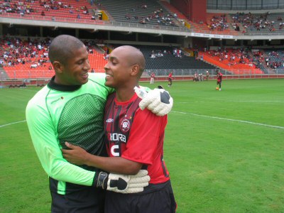 Goleiro Jefferson e Rodriguinho, ex-companheiros do júnior do Atlético [foto: FURACAO.COM] | |
