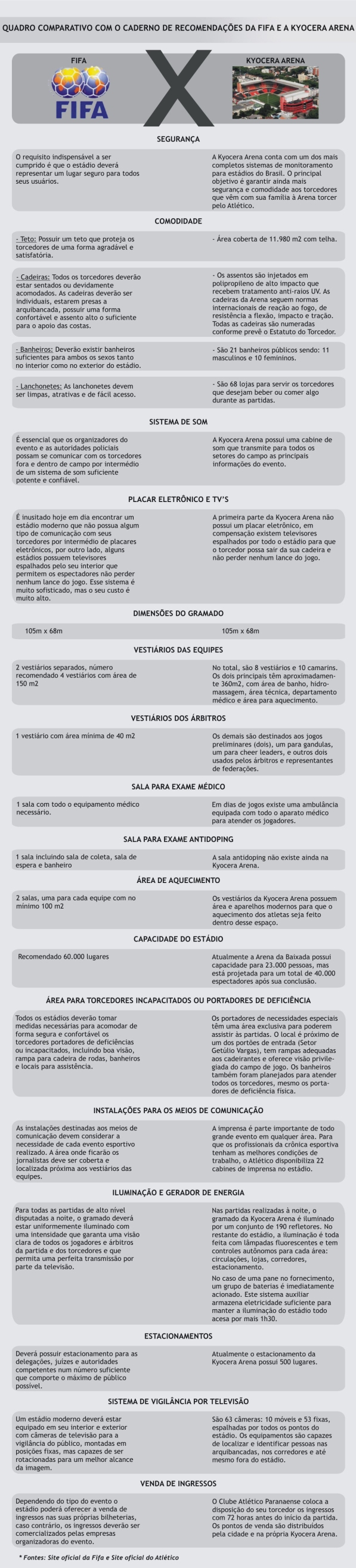 Abaixo demonstraremos em forma de um quadro comparativo o que recomenda o caderno da Fifa e o que a Kyocera Arena possui hoje, mesmo sem ter feito a conclusão total do estádio. É importante ressaltar que nenhum outro estádio do Estado do Paraná e até do território brasileiro está em condições tão avançadas em relação às recomendações da Fifa para receber jogos da Copa. Vale lembrar, ainda, que esses itens são os apresentados na Kyocera Arena hoje. Com as obras de conclusão do estádio, evidentemente que toda essa estrutura será ampliada e melhorada, atendendo aos critérios recomendados pela Fifa em segurança, infra-estrutura e comodidade.