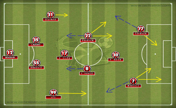 Porém, este 4-2-3-1 apresenta aspectos de jogo diferentes ao 4-2-3-1 de Ricardo Drubscky. Com o antigo técnico, o Atlético pressionava já na saída de bola, a linha defensiva se posicionava em linha alta e realizava a compactação dos jogadores próximo da linha do meio-campo e a área do goleiro adversário. Para que todos estes aspectos fossem realizados, a marcação pressão dos jogadores de frente tinha que ser constante. Caso o asfixiamento em campo ofensivo não acontecesse, o que realmente não acontecia com tanta frequência no tempo de Drubscky, os jogadores adversários conseguiam ter tempo para lançar a bola em profundidade para os seus atacantes e, assim, explorar o espaço entre a linha defensiva atleticana e o gol do Weverton.