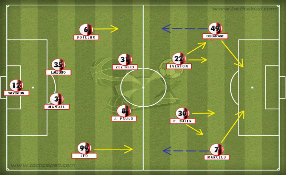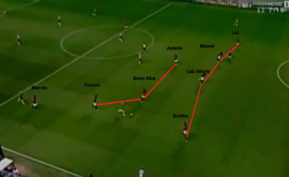 Observe-se onde está o Marcelo em relação à bola, e este já posicionado para explorar o espaço deixado pelo lateral do Atlético-MG que estava começando a subir ao ataque.