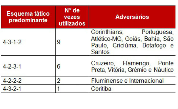 Vale lembrar que as partidas onde o 4-3-1-2 foi utilizado o Atlético estava com o Vagner Mancini no comando técnico. Ainda com o mesmo treinador, o Furacão variou uma vez para o 4-2-2-2, uma para o 4-2-3-1 e outra para o 4-3-2-1.