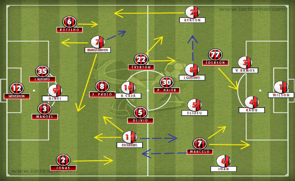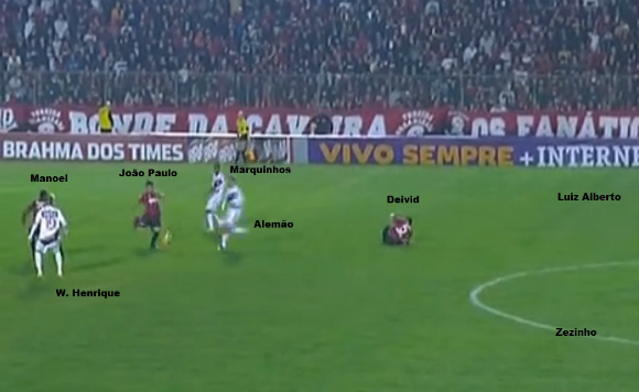 Percebendo a dificuldade que o seu time passava, Ney Franco colocou os atacantes Alemão e William Henrique nos lugares de Renato Cajá e Luiz Gustavo. Com isso, o técnico do Vitória definiu que Ayrton tivesse que marcar as subidas de Éverton e bagunçou as marcações defensivas já definidas por Vagner Mancini. Agora com quatro atacantes ou Zezinho voltava para ajudar na marcação de algum deles ou Manoel, Luiz Alberto, Deivid e João Paulo iriam ficar sem sobra no campo de defesa. Foi a segunda opção que prevaleceu. Observa-se pelo flagrante, a bola no campo de defesa atleticano logo após uma disputa aérea entre Luiz Alberto e Dinei no meio de campo, e vejam o risco que é deixar sem sobras a marcação neste setor do campo: