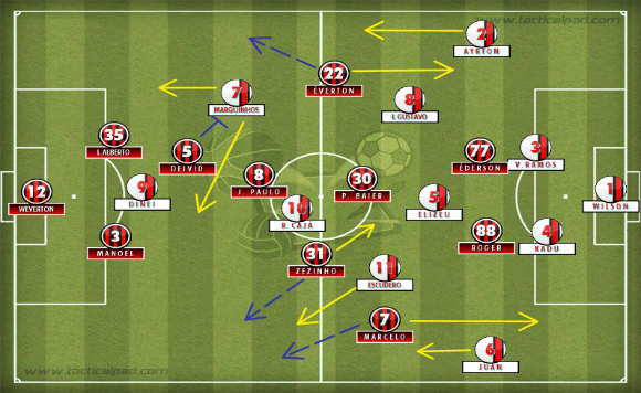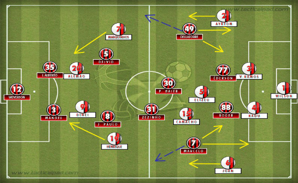 Com o 3-5-2, Vagner Mancini fez com que o Atlético propusesse diversos duelos individuais em campo. Pelo desenho, observa-se Deivid e Marquinhos, João Paulo e Renato Cajá, Zezinho e Escudero, Marcelo e Juan, Éderson e Victor Ramos, Roger e Kadu e Éverton criando a indecisão para o sistema defensivo baiano. Com imensa vontade que o Furacão entrou para o segundo tempo e a constante movimentação de seus jogadores de frente, o camisa 22 atleticano não era marcado direito nem por Ayrton e nem pelo jovem Luiz Gustavo e fez com que os três gols do Furacão saíssem pelo seu setor.