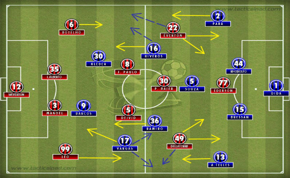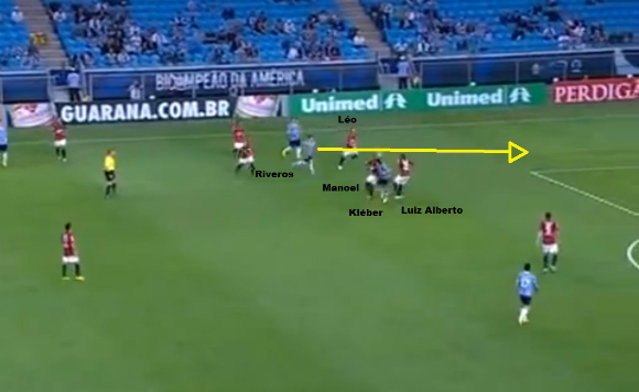 Muitas dessas finalizações do Grêmio foram realizadas através das entradas na diagonal de Vargas e de Riveros. Estas subidas foram frequentemente possíveis, pois ou Manoel ou Luiz Alberto acompanhavam um dos dois atacantes do Grêmio que saía para receber a bola e, assim, abria espaço entre um lateral atleticano e o zagueiro que subiu. No flagrante adiante, o espaço aberto foi entre Léo e Manoel e aproveitado por Riveros que realizou o gol da partida: