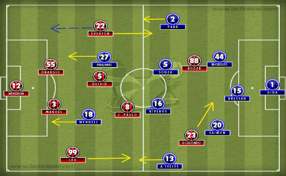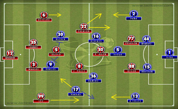 A opção de escolha de Vagner Mancini para o 4-2-3-1 foi pelo fato de facilitar as marcações em todos os jogadores gremistas que sobem ao ataque. Porém, o comandante atleticano não contava que Kleber não faria a recomposição defensiva pela direita e jogaria no espaço vazio entre João Paulo, Pedro Botelho e Luiz Alberto. Já para compensar tal liberdade, Riveros e Ramiro trocavam de lado frequentemente, fazendo a composição defensiva pela direita do Grêmio.