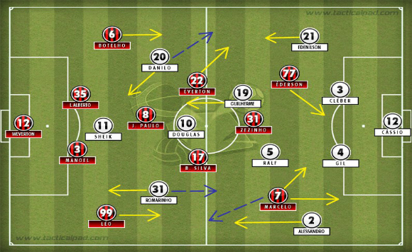 Contudo, Tite, técnico do Corinthians, colocou o meia Romarinho e o lateral direita Alessandro, no lado esquerdo do campo com funções de marcar o forte lado direito atleticano. Devido aos êxitos desta dupla em marcar as subidas de Léo e Marcelo, o Atlético passou a não subir tanto deste lado como de costume. Contra este time paulista, o Furacão subiu ao ataque pelo lado direito somente 39% das vezes enquanto que, normalmente, o time atacava mais da metade por esta faixa do campo.