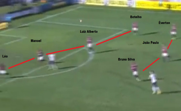 Com o lado direito rubro-negro congestionado, o lado esquerdo, com Pedro Botelho e Everton, foi quem tomou a responsabilidade para atacar durante todo primeiro tempo. Para que o lado esquerdo conseguisse atacar, a transição da movimentação defensiva para ofensiva de Éverton foi fundamental. Quando o Atlético era atacado pelo lado esquerdo de seu campo, o camisa 22 rubro-negro formava uma linha com João Paulo e Bruno Silva. Vejam pelo flagrante a seguir, o posicionamento desta linha de três jogadores atleticanos: