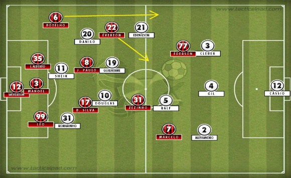 Agora quando Everton atacava, ele partia desta posição defensiva e se locomovia nas costas de Guilherme, o 2° volante do Corinthians. Assim, abrindo espaços para ultrapassagens de Pedro Botelho.