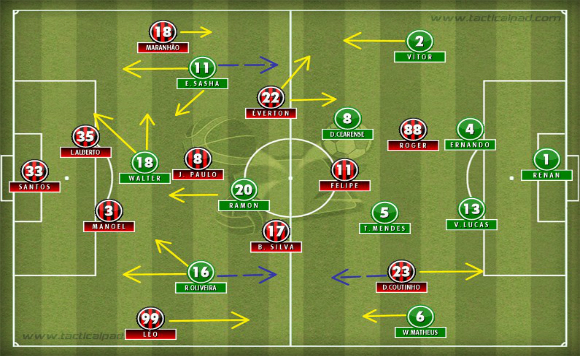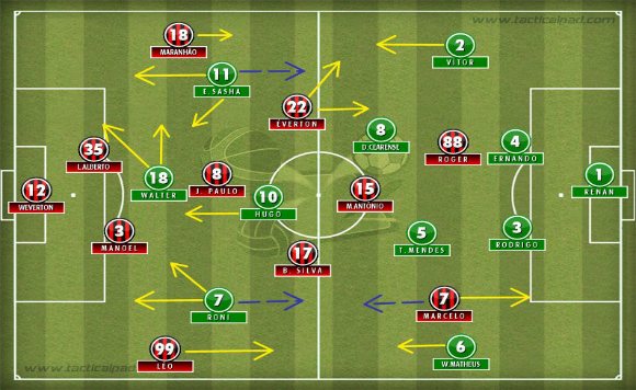 Com a opção de Vagner Mancini em deixar Éderson no banco de reservas, o Atlético não criou e finalizou tanto quanto em outras partidas. Uma parte foi em razão das ausências do maestro Paulo Baier, suspenso e do artilheiro, mas, no jogo contra o Goiás essa dificuldade ficou ainda maior devido à boa exibição do time esmeraldino. Enderson Moreira, técnico do Goiás que comanda a equipe goiana há dois anos, fez com que a sua equipe jogasse de forma mais intensa e não permitiu uma boa exibição dos comandados de Vagner Mancini.