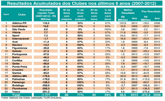 O estudo, que avaliou os resultados dos clubes brasileiros nos últimos seis anos com base no relatório do balanço financeiro dos mesmos, destaca que o melhor resultado já apresentado por um clube foi o Atlético Paranaense em 2012, com um superávit de R$ 123 milhões.