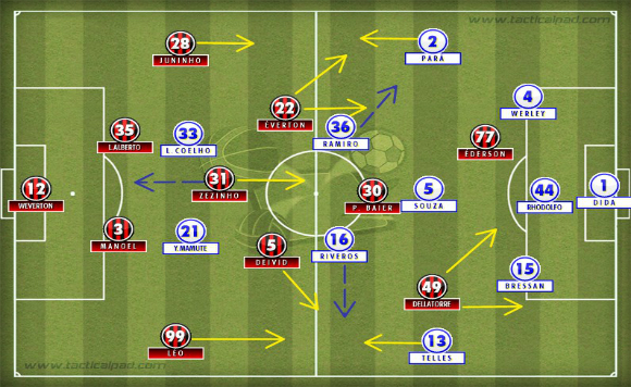 Já as entradas de Ciro, João Paulo e Fran Mérida nos lugares de Dellatorre, Zezinho e Paulo Baier foram com intenções de ter mais velocidade no ataque e se defender melhor. Pois o Grêmio, no segundo tempo, atacou mais e finalizou 6 vezes (quatro vezes mais do que no primeiro tempo).