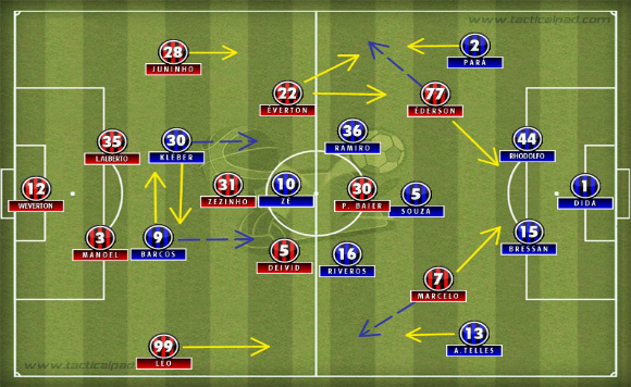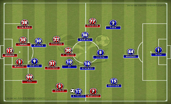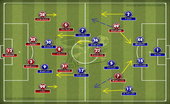 Pois uma vez que Deivid, Zezinho e Éverton flutuavam alinhados de acordo com o lado da jogada; Paulo Baier, muitas vezes, se posicionou, atrás da linha da bola; e, de acordo com o lado que o Grêmio subiu ou Marcelo ou Éderson recuava até próximo do meio campo, o time gaúcho não conseguiu ter espaços para atacar no primeiro tempo inteiro. Além de contar com esta organização tática defensiva rubro-negra, Ramiro e Riveros (os dois volantes tricolores que normalmente subiam ao ataque) não souberam quando e como atacar e, também, não realizaram a cobertura do lateral ao seu lado que apoiava o ataque gaúcho. Este time do Grêmio que pouco jogou no 4-3-1-2 e sentiu a falta de costume do esquema.