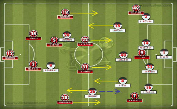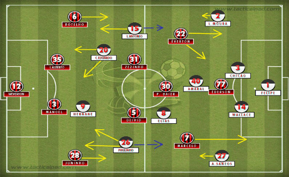 Com Zezinho e Éverton recuados para armar o jogo vindo de trás e com Deivid podendo marcar Carlos Eduardo, Juninho e Maranhão passaram a subir simultaneamente e mais frequentemente [arte: Caio Gondo]