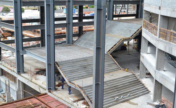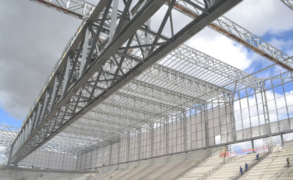 Outro avanço significativo foi na cobertura do estádio. As duas vigas principais estão concluídas e em fase de finalização a instalação das vigas secundárias e das peças de policarbonato da cobertura. Também foram concluídos os trabalhos de construção de escadas e de alvenaria em todos os níveis internos e todos os setores do estádio.