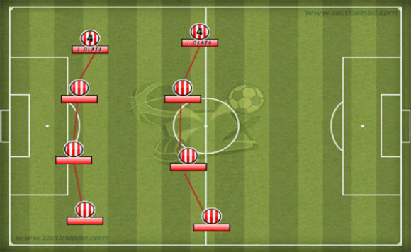 Lucas Olaza, que é lateral-esquerda, no River Plate (URU) já atuou na sua posição de origem, também, como ala esquerda e até na esquerda no meio de campo do 4-4-2 em linha. Devido à sua boa eficiência ofensiva, este posicionamento mais ofensivo no Atlético é interessante para Miguel Ángel Portugal.