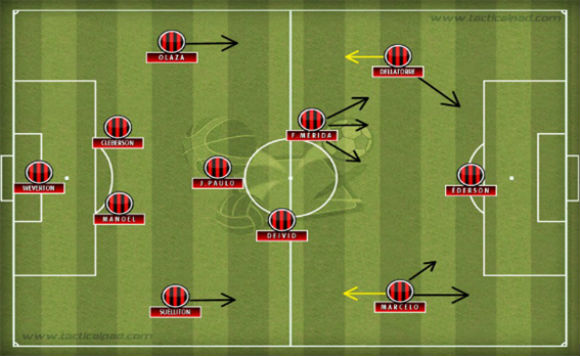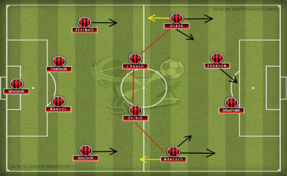 Lucas Olaza na esquerda com uma linha de quatro jogadores no meio de campo do 4-4-2 em linha [arte: Caio Gondo]