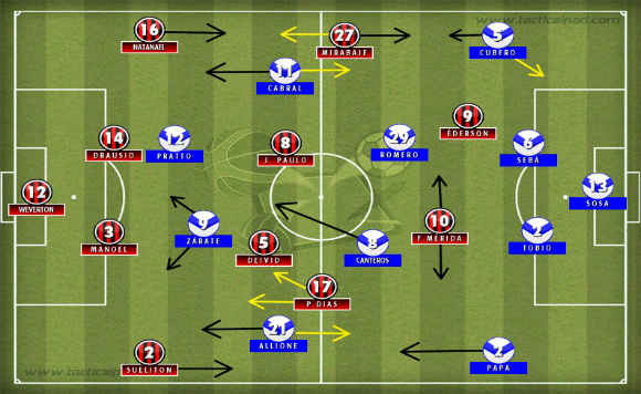 Para jogar o segundo jogo contra o Vélez Sarsfield nessa Copa Libertadores, Miguel Portugal manteve os mesmos titulares e esquema tático do último jogo contra o Universitario. Já José “Turu” Flores, técnico do Vélez Sarsfield, iniciou com o volante Desábato e o jovem meia Jorge Correa, nos lugares de Canteros e Mauro Zárate (poupado desta partida). Apesar das trocas de jogadores, o time argentino manteve o 4-4-2 em linha.