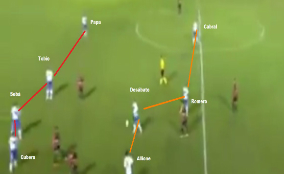 O primeiro gol dos argentinos foi de Allione, e através da jogada que iria ser a geradora do terceiro gol também: o contra-ataque. Por iniciar a marcação somente no meio de campo através de seus meio-campistas e por começar com o velocista Jorge Correa como titular, o Vélez Sarsfield já havia anunciado este intuito de jogo já desde o começo dele. Já que Correa e Pratto sequer tinham funções defensivas e ficavam em campo ofensivo mesmo com o seu time sendo atacado.