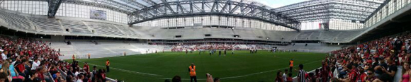 Voltamos para casa! Esse foi o sentimento dos 10 mil atleticanos que compareceram no primeiro jogo-teste na Arena, realizados na tarde deste sábado. Os torcedores presentes foram surpreendidos com uma estrutura de primeiro mundo, que faz da Arena um dos melhores estádios do Brasil. Veja a foto panorâmica do novo estádio atleticano: