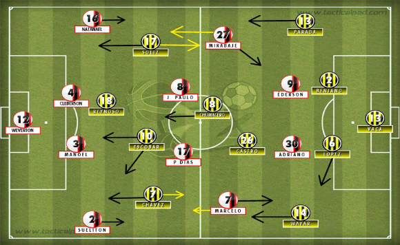 The Strongest no 4-2-3-1 e com Escobar atraindo a marcação de Manoel