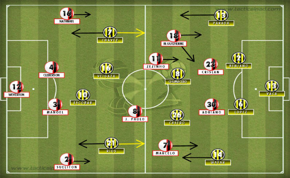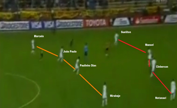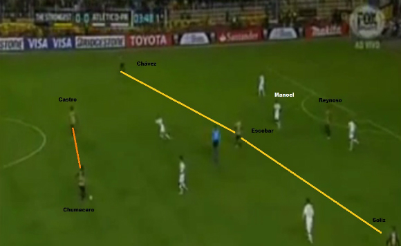 Com o Atlético se defendendo e sem conseguindo armar um contra-ataque decente, o The Strongest foi crescendo na partida. O time boliviano iniciava o seu ataque 4-2-3-1, mas com o desenrolar da jogada, Pablo Escobar se projetava como segundo atacante. Devido à esta movimentação, este jogador se deslocou às costas dos volantes atleticano e fazia com que um dos zagueiros se projetasse saísse da linha defensiva rubro-negra. Assim como mostra a imagem a seguir: