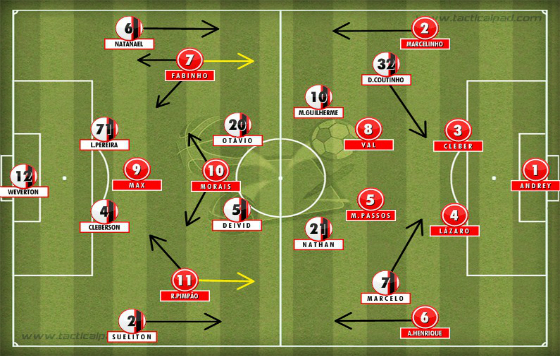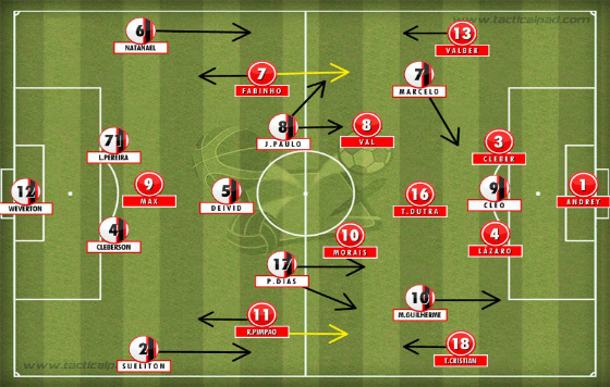 Ao assumir mais uma vez o comando técnico interinamente, Leandro Ávila alterou o esquema tático da equipe: do 4-2-3-1, o time passou a jogar no 4-2-2-2. Neste esquema, Nathan e Marcos Guilherme ficam responsáveis pela criação da jogadas de cada lado do campo e Marcelo e Douglas Coutinho iniciam a transição ofensiva abertos. Quando a bola for para um dos lados, um permanece aberto enquanto que o outro centraliza em direção à área adversária. Como os dois volantes pouco participam do sistema ofensivo, Sueliton e Natanael têm liberdade para subir freqüentemente ao ataque. Já o América-RN atuou no 4-2-3-1 com dois volantes que pouco saiam para o ataque e o trio de meias que se movimentavam constantemente em ação ofensiva.